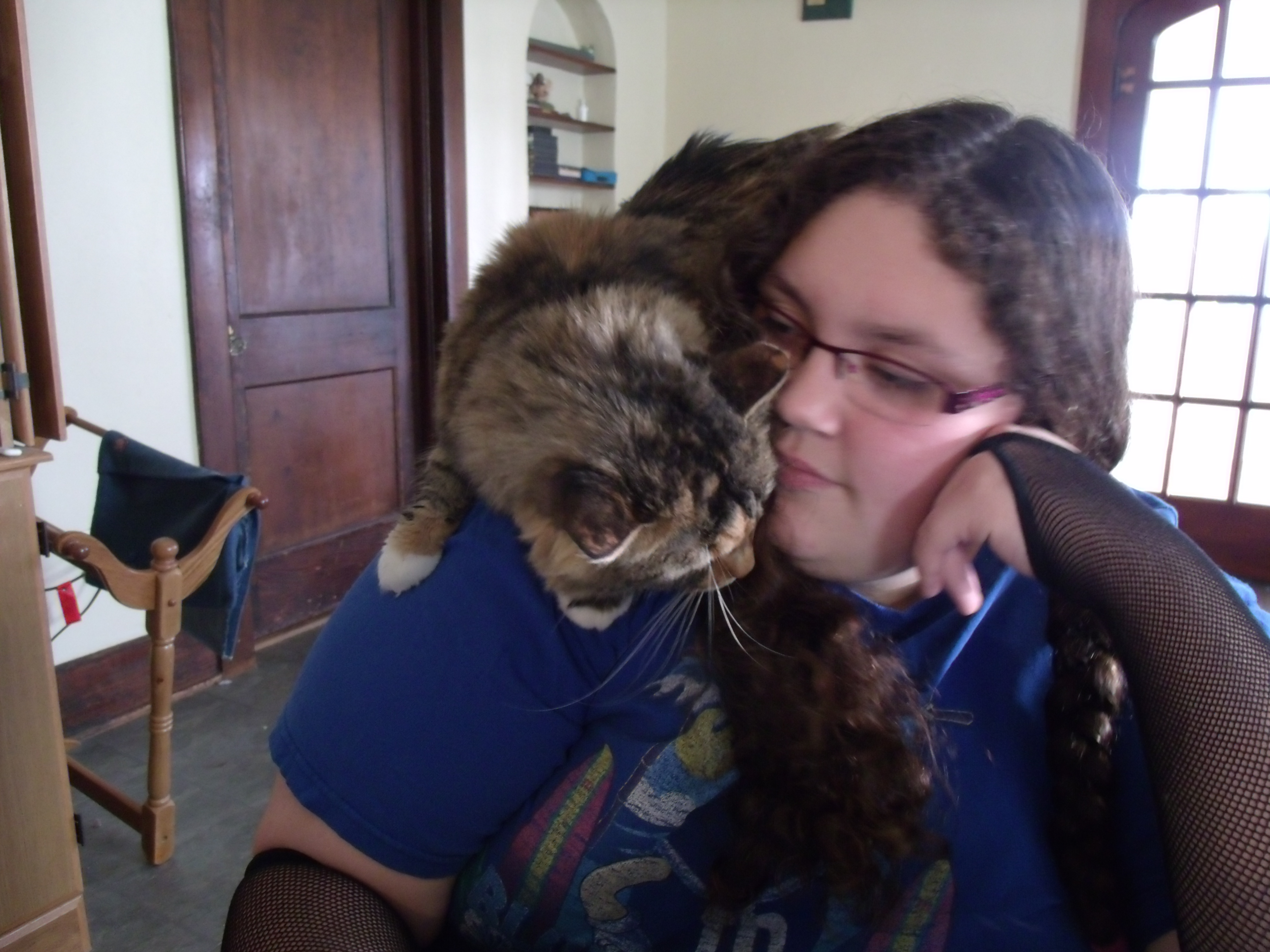 I was holding my little spoiled Jinx dog, and she was doing her best to hug and kiss me. Bela was watching and laughing (of course). When I told Jinx, “Your breath smells like a pencil,” Bela really cracked up. She thought I was nuts.
