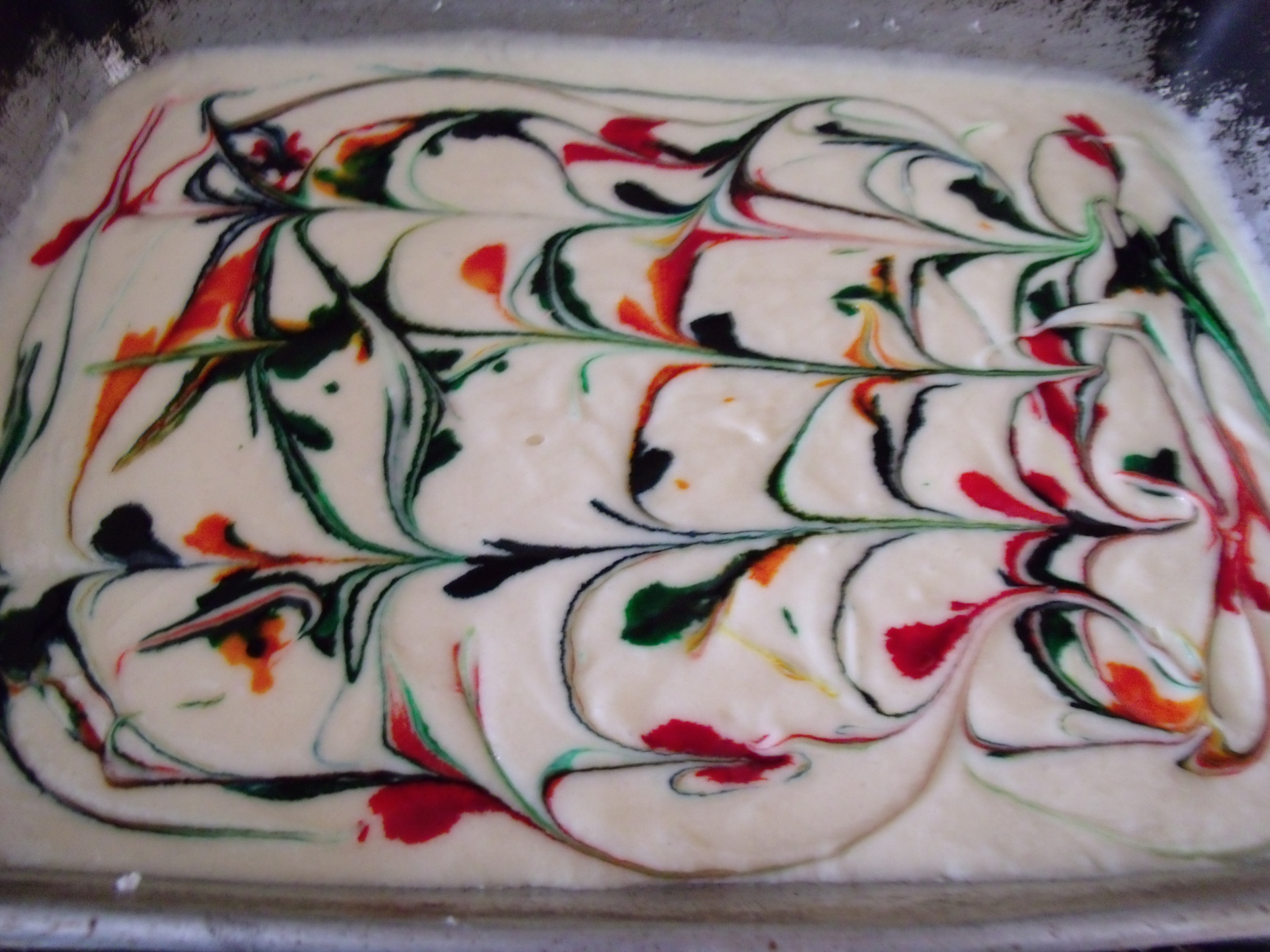 Since I had conquered today’s meals, I was looking for something else….that’s when I found a box of cake mix in the cabinet. Hmmmm. Why not? I also noticed a small box of food coloring, so I added a few drops of color to the batter. 🙂