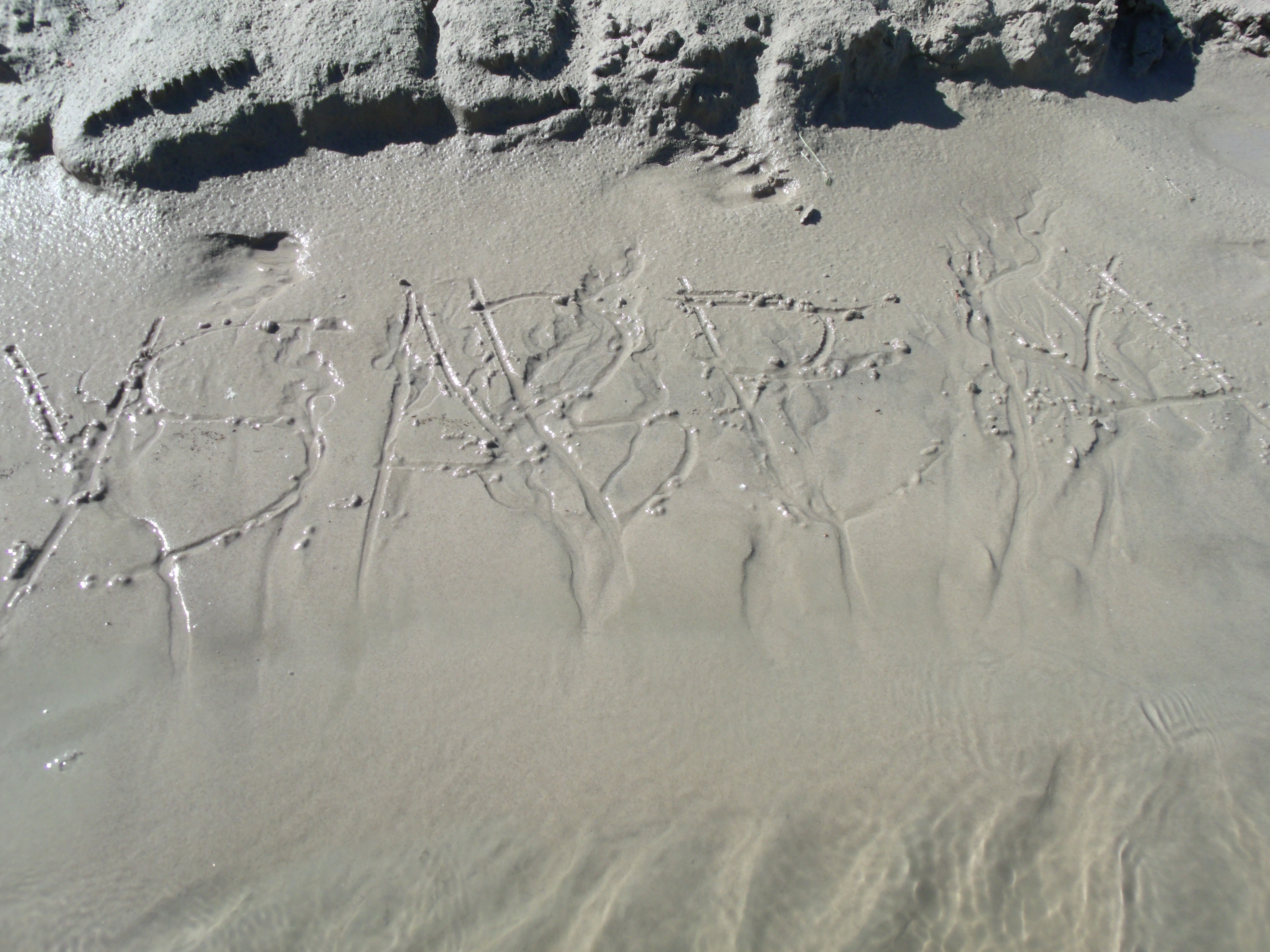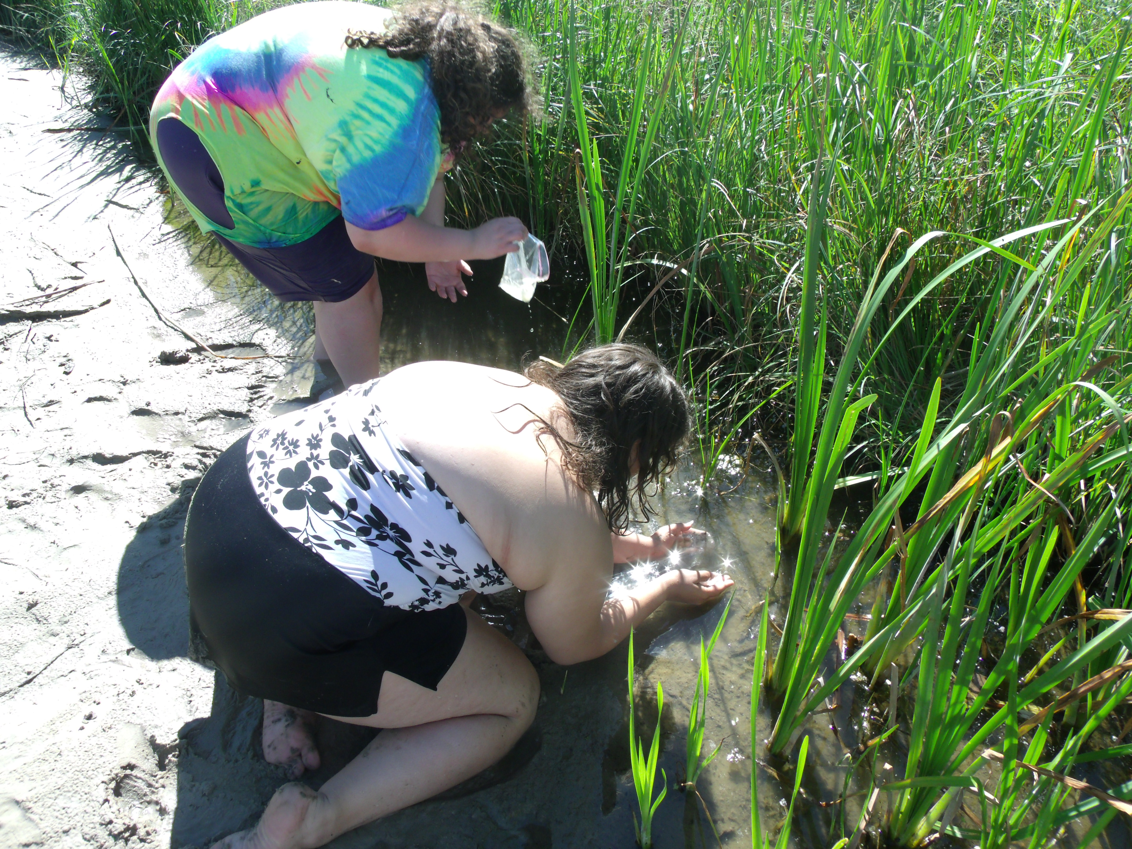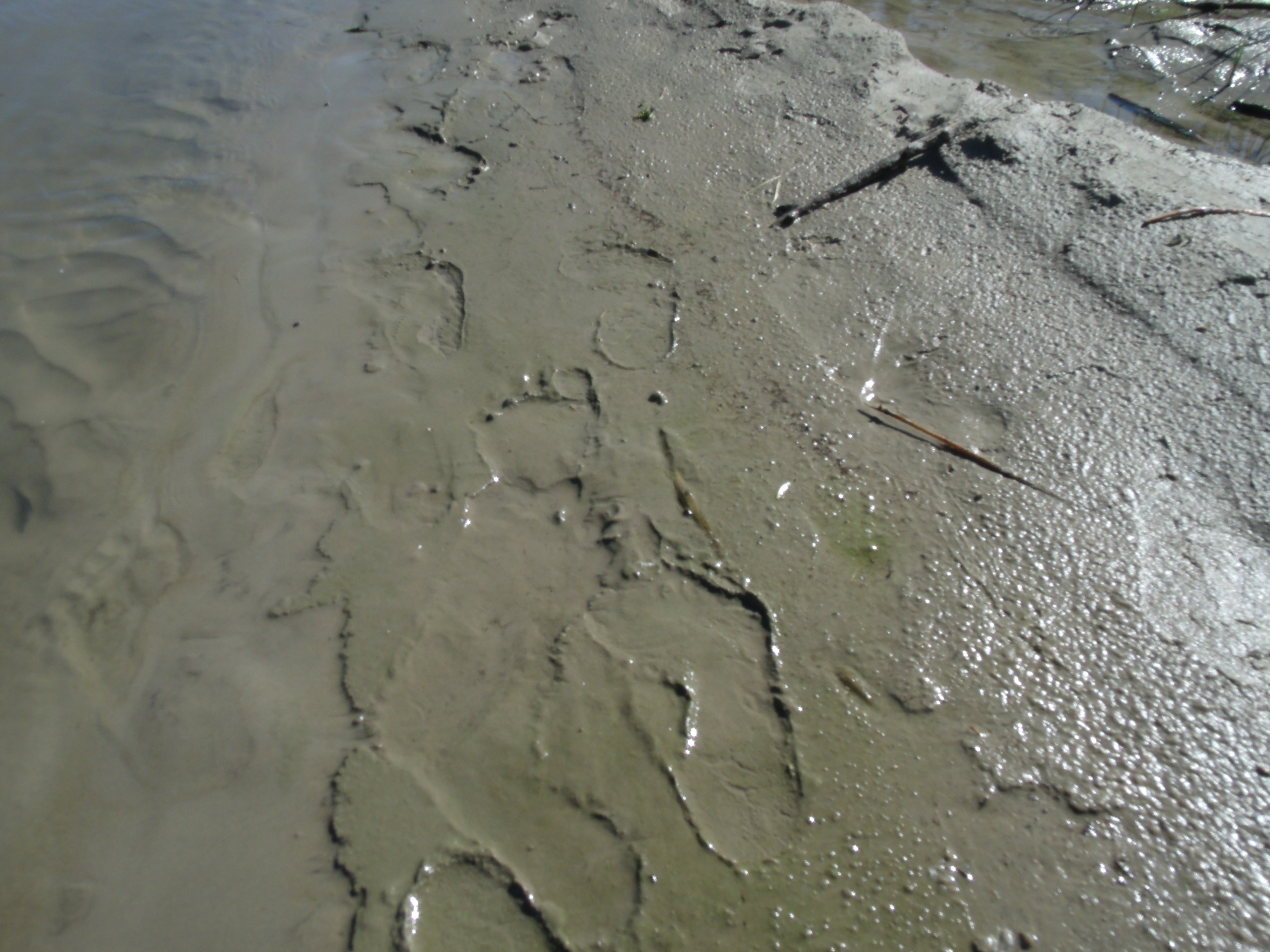 It took maybe three hours to get to the vehicle, but once there, the girls chased frogs or tried to grab tiny fish. I waded around while Stacey took Glenn for his truck. Bela took time to write her name in the mud.