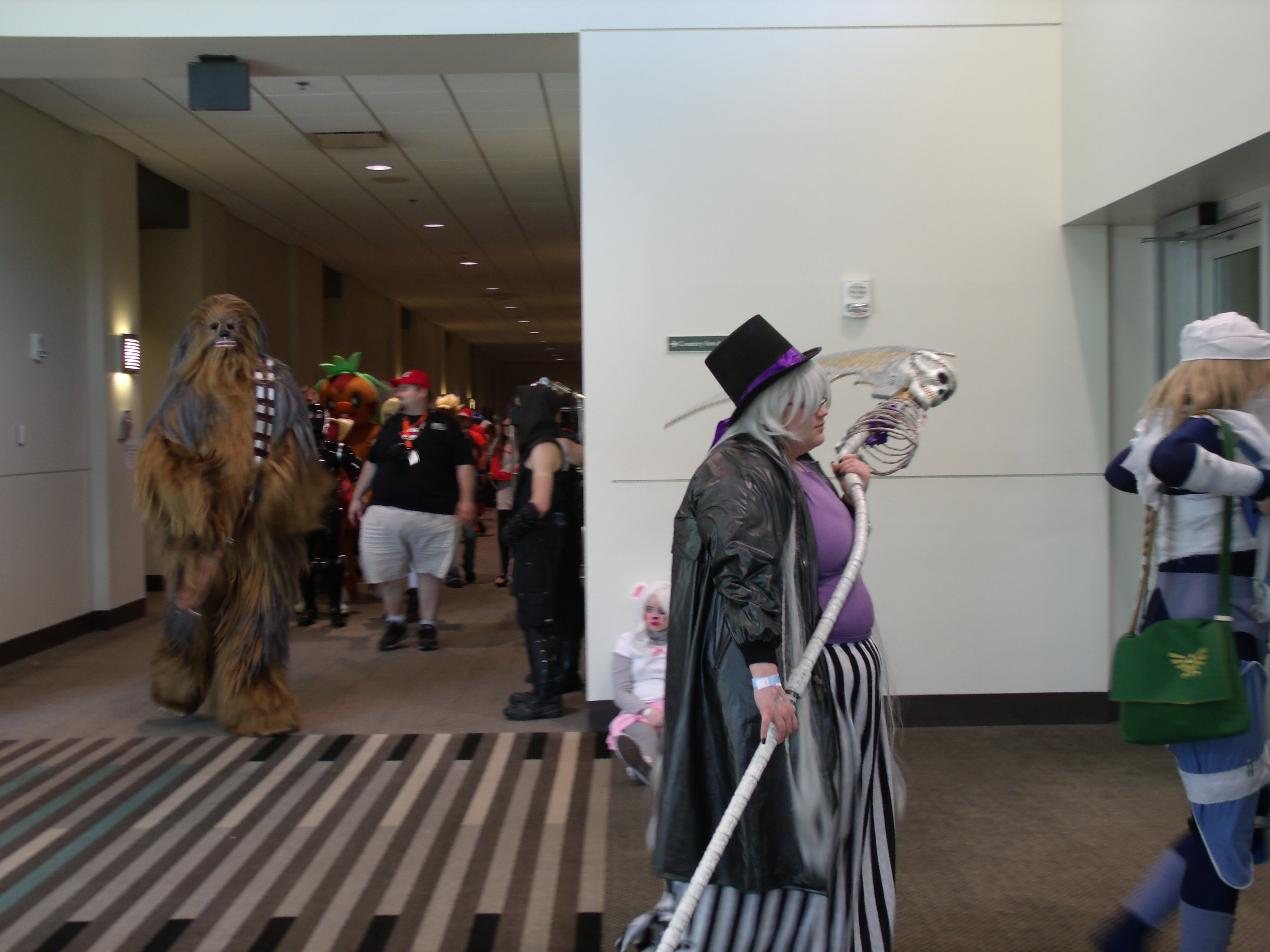It finally was time to check in for the costume contest, so Bela had her number (42) in her pocket. I was surprised to discover that I also had a number—42H. The H was for “handler.” Interesting notion. Since Bela is a minor, I had to be there for the judging. Some cosplayers had two or more people leading them around and helping them with their props.